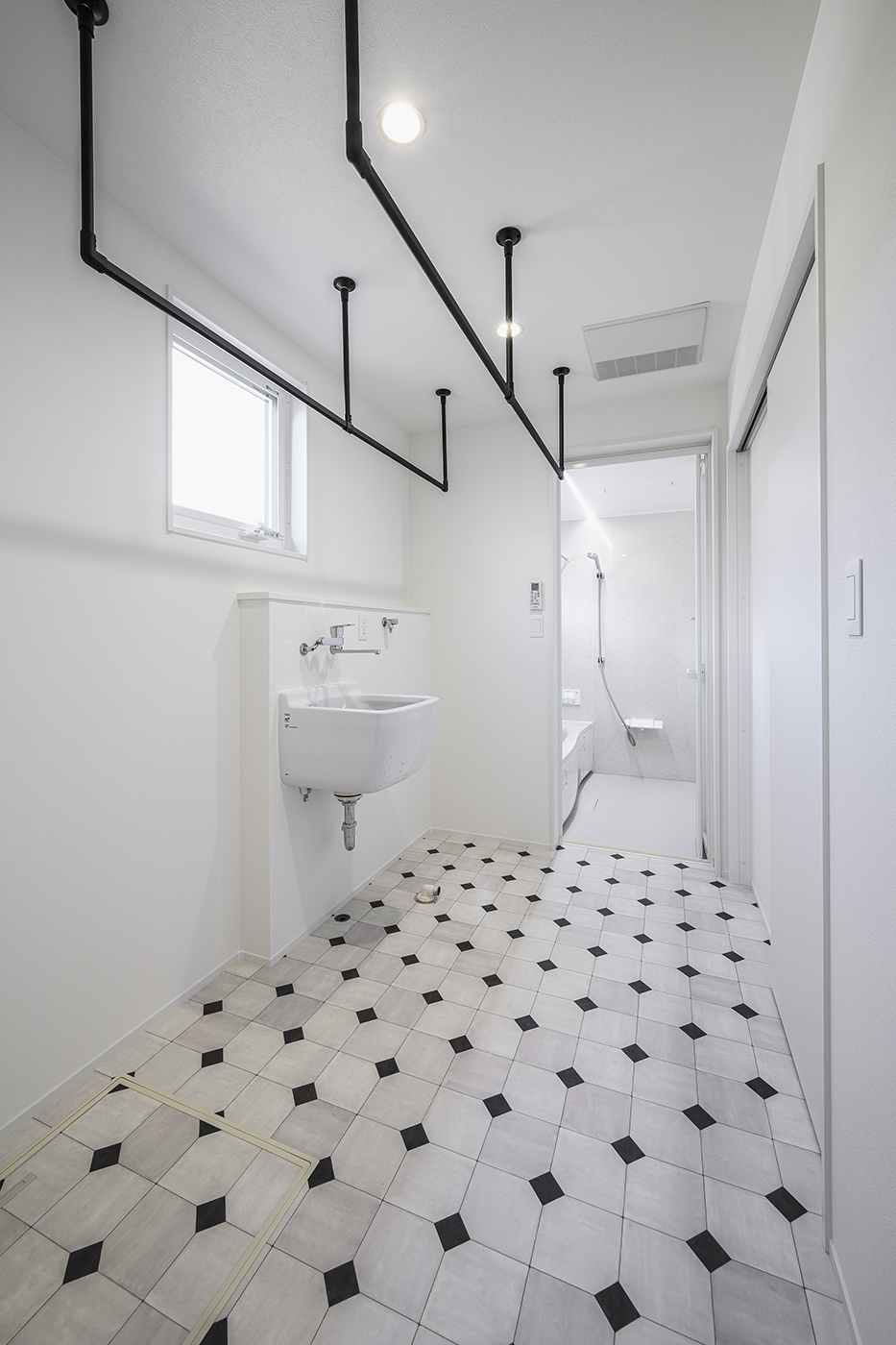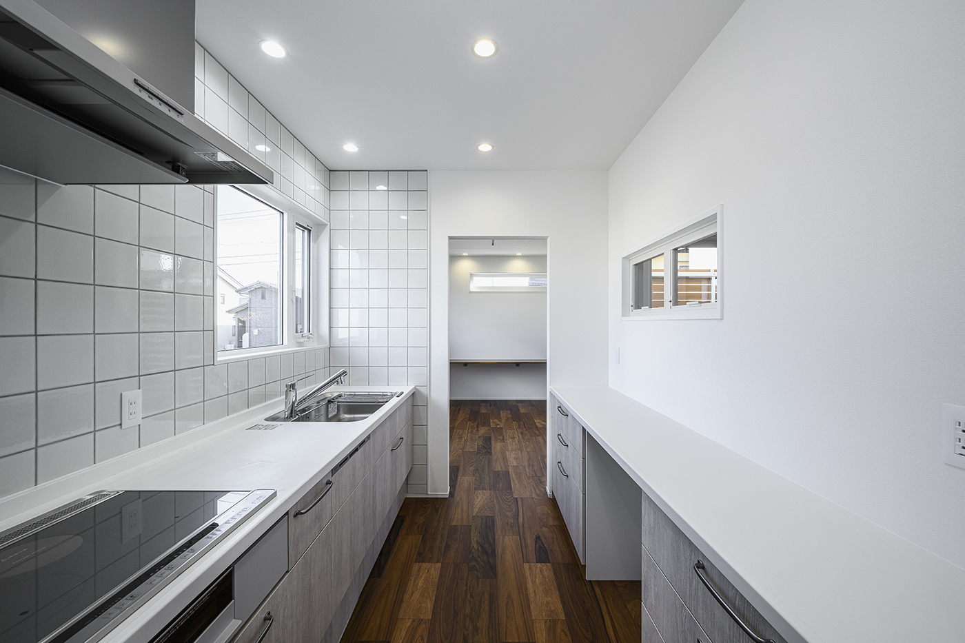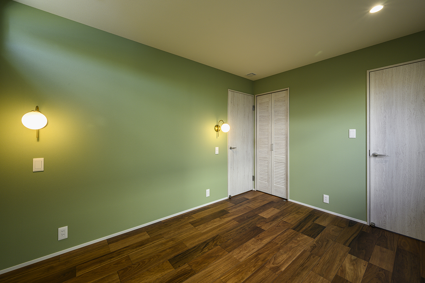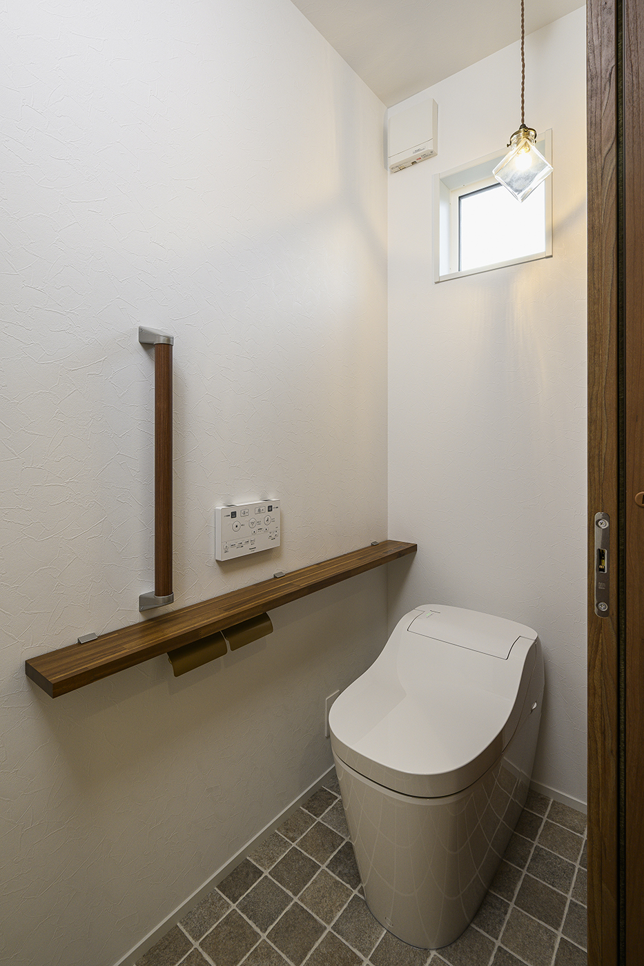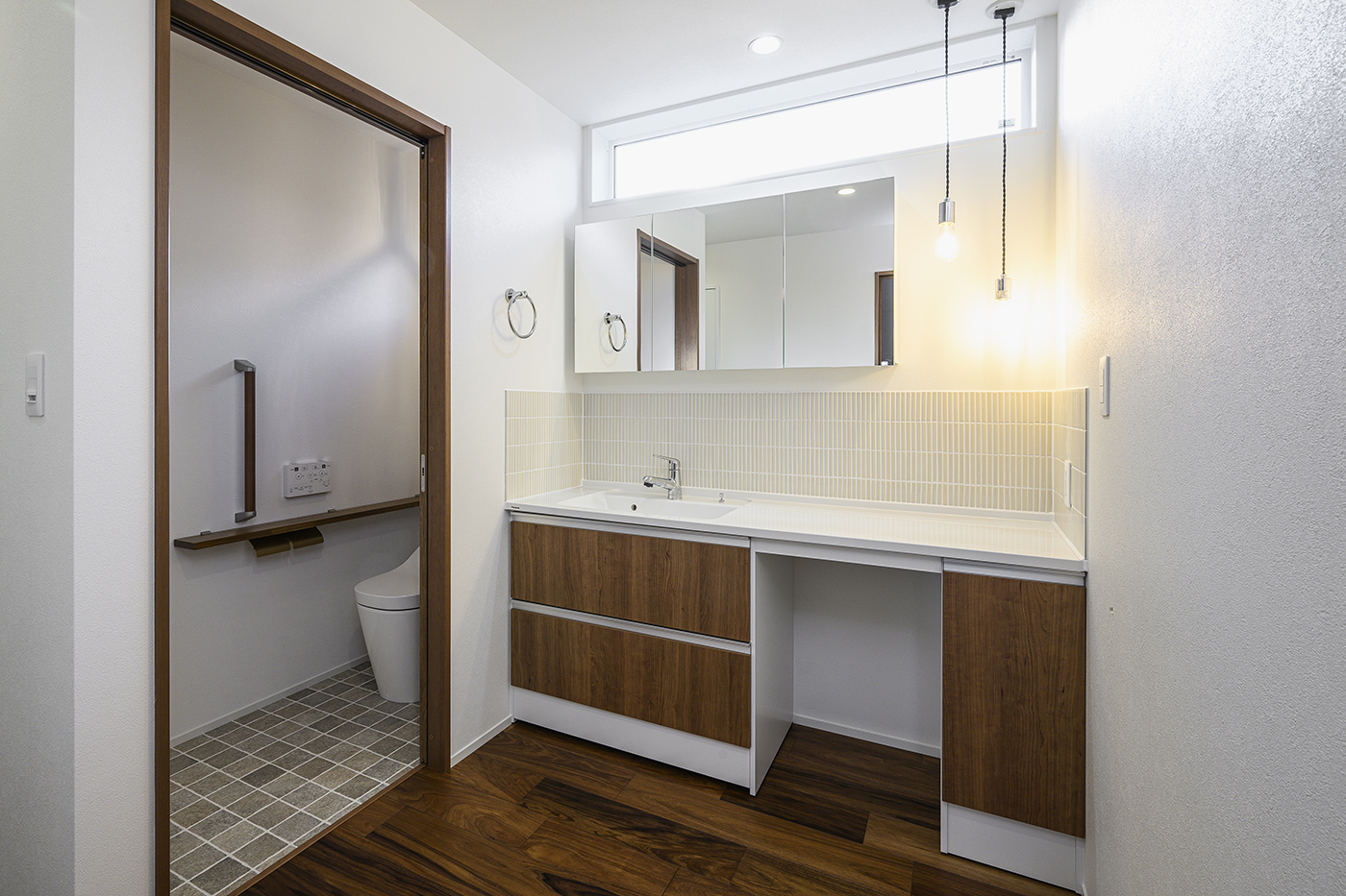 アクセントクロスやタイル、建具、照明器具にもこだわった内装は