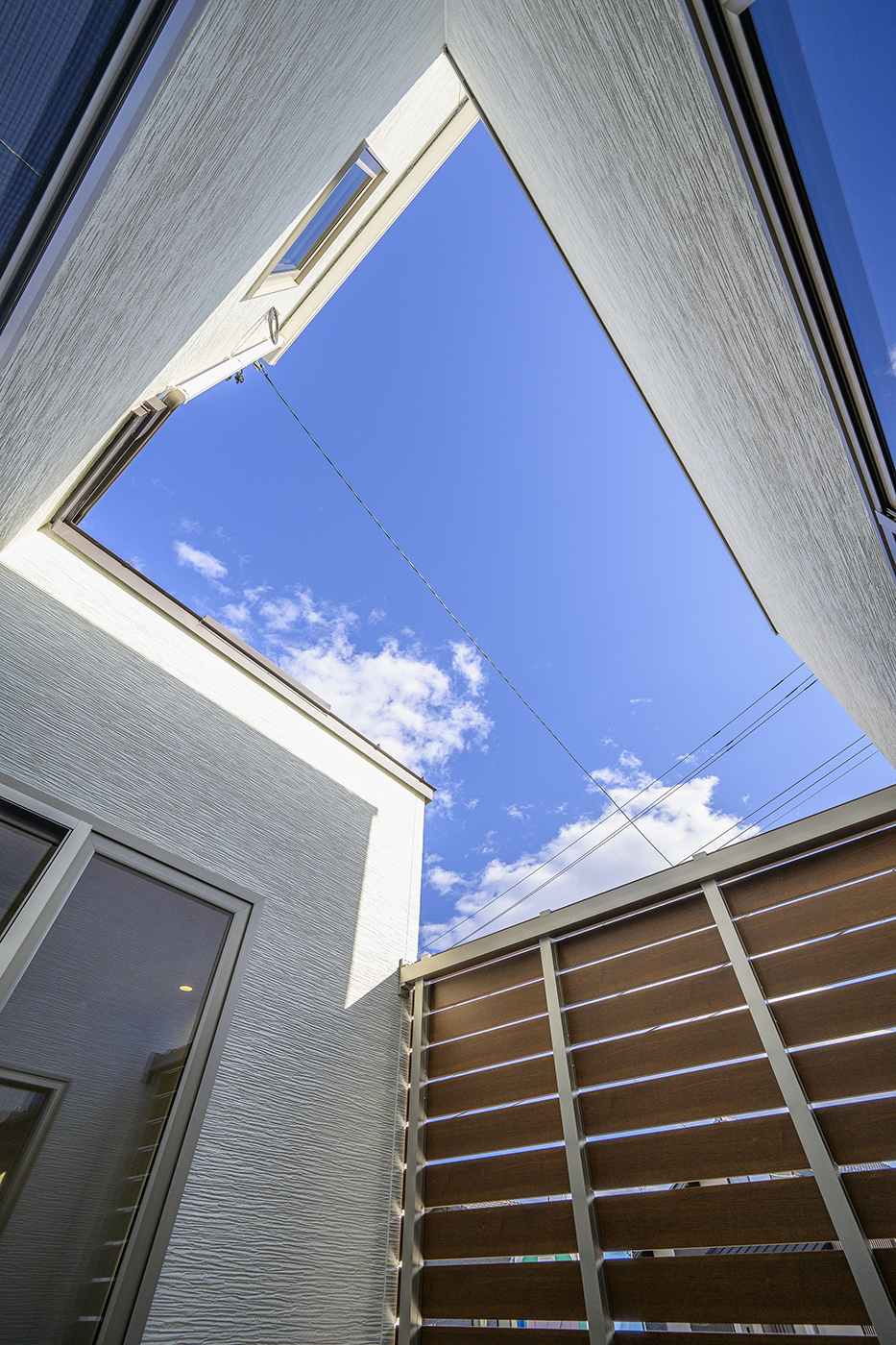 白い外壁に木目のフェンスが映えるシンプルな箱型の家。