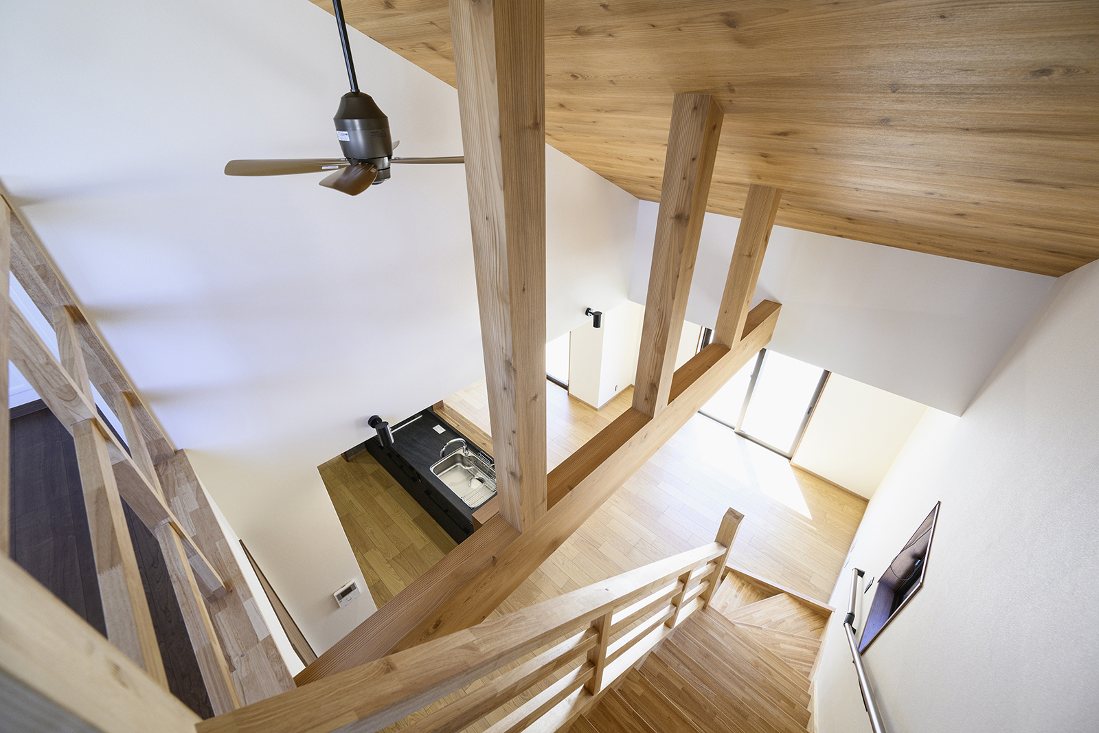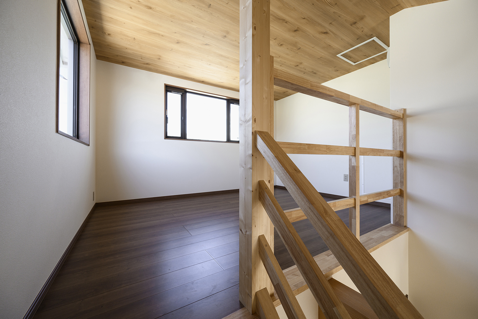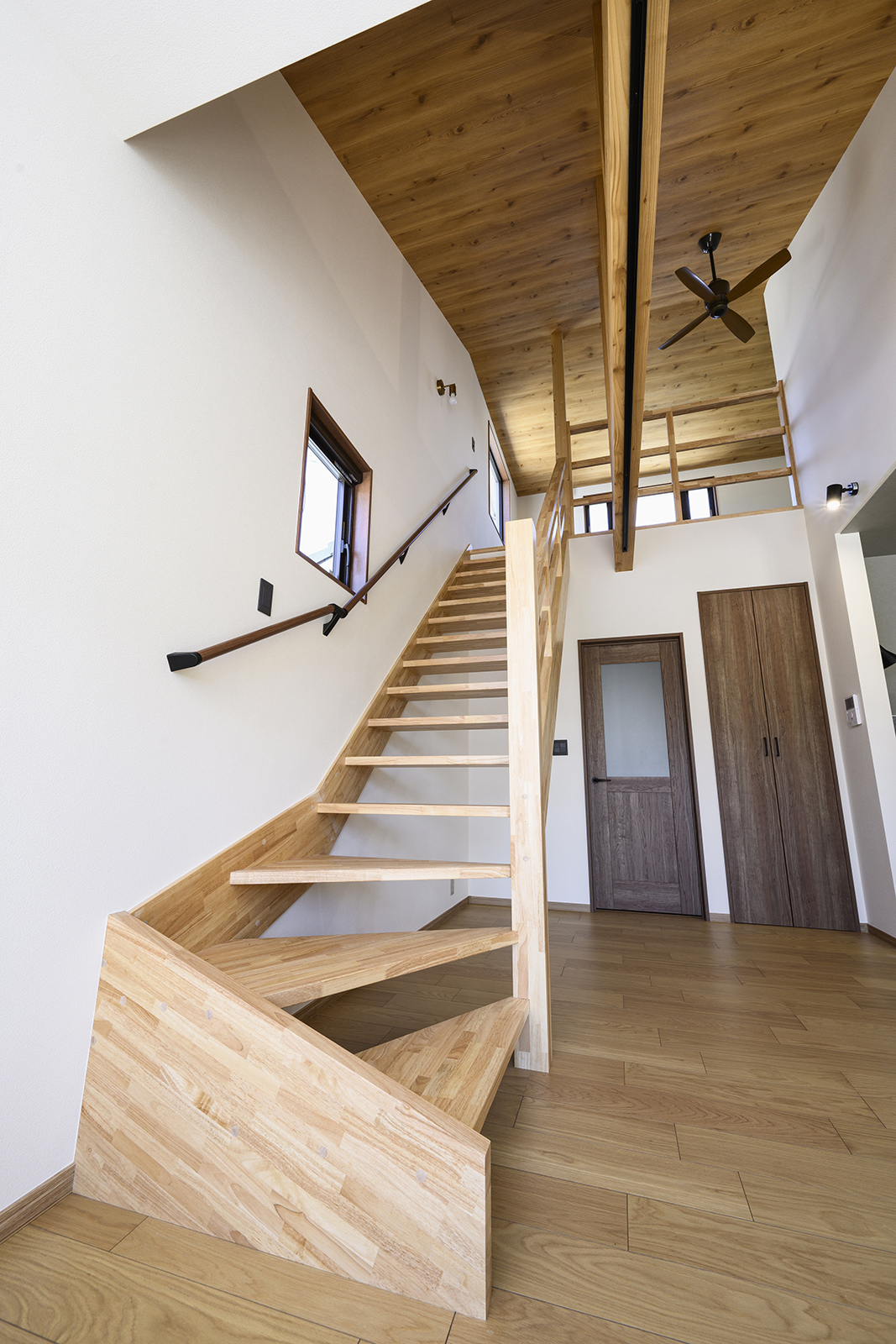 木の質感が印象的なスケルトン階段をあがった先にある小屋裏部屋は